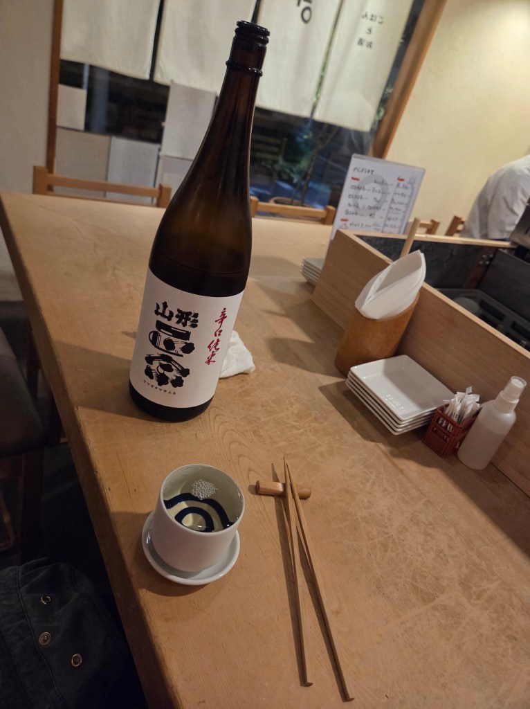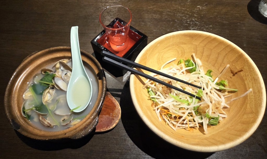 Had a very good introductory evening in Japan last night. Didn’t get to hotel in Fukushima till around 8 PM. Then went out to find some food. A lot of small eateries in the vicinity here. The one we chose, without any knowledge, turned out to be a good choice. They have small separate rooms for diners where they close a sliding door that is open weaved so you have your own semi-private space. I had a white radish, onion, dry bonito flakes salad and a bowl of clams in broth. I just wanted to eat light this first evening. Also, an order of sake.
