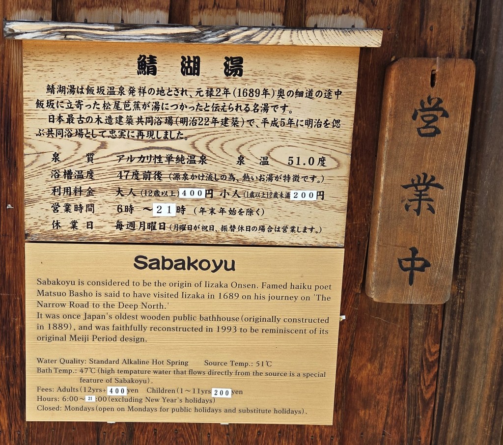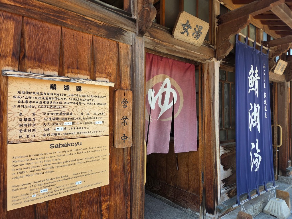 Iizaka Onsen is a small town famous for its hot springs. Sabako-yu is the oldest of the nine onsen in the town. We specifically wanted to go to that one because it is said that Basho had bathed in the very same one.
