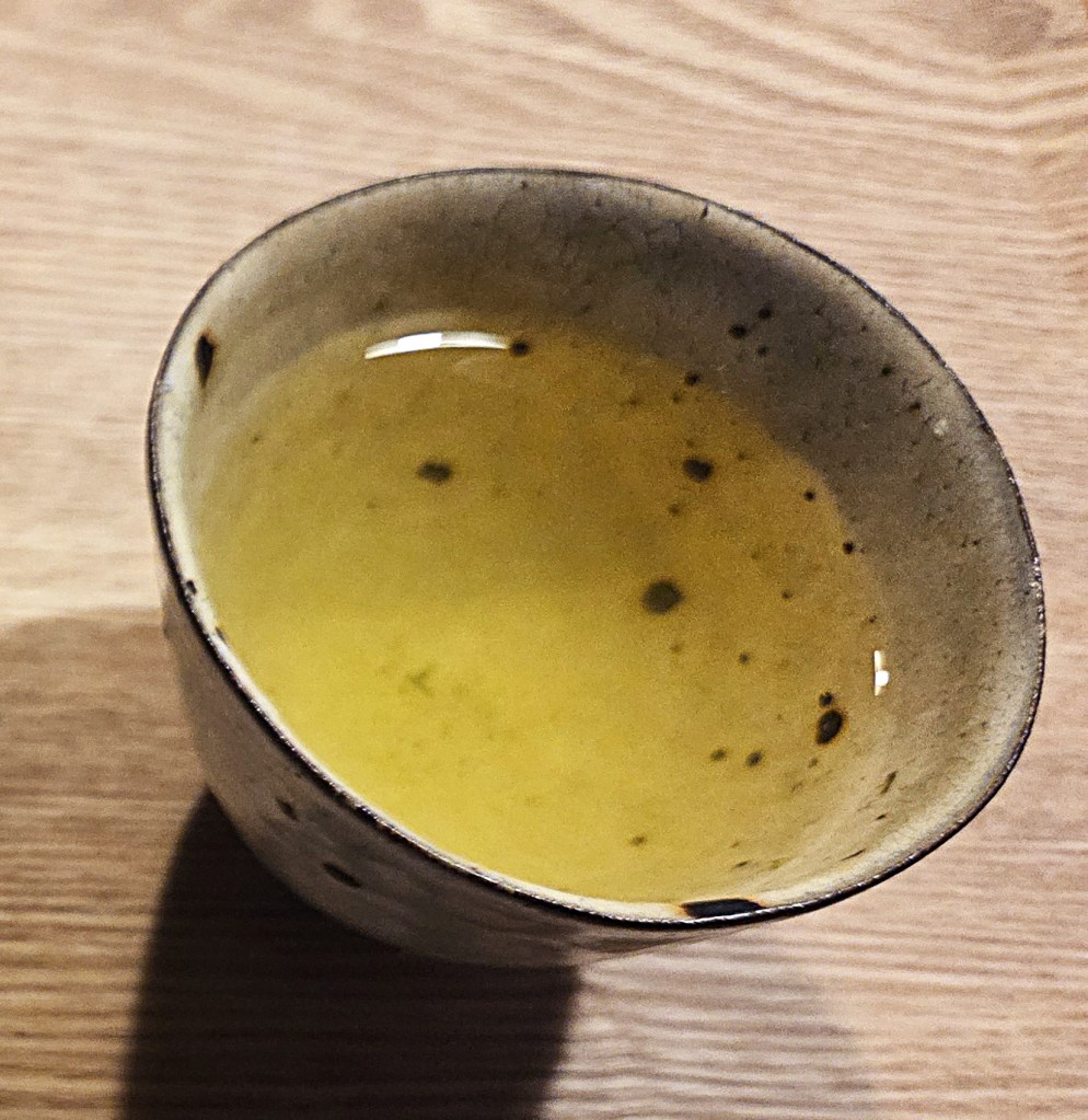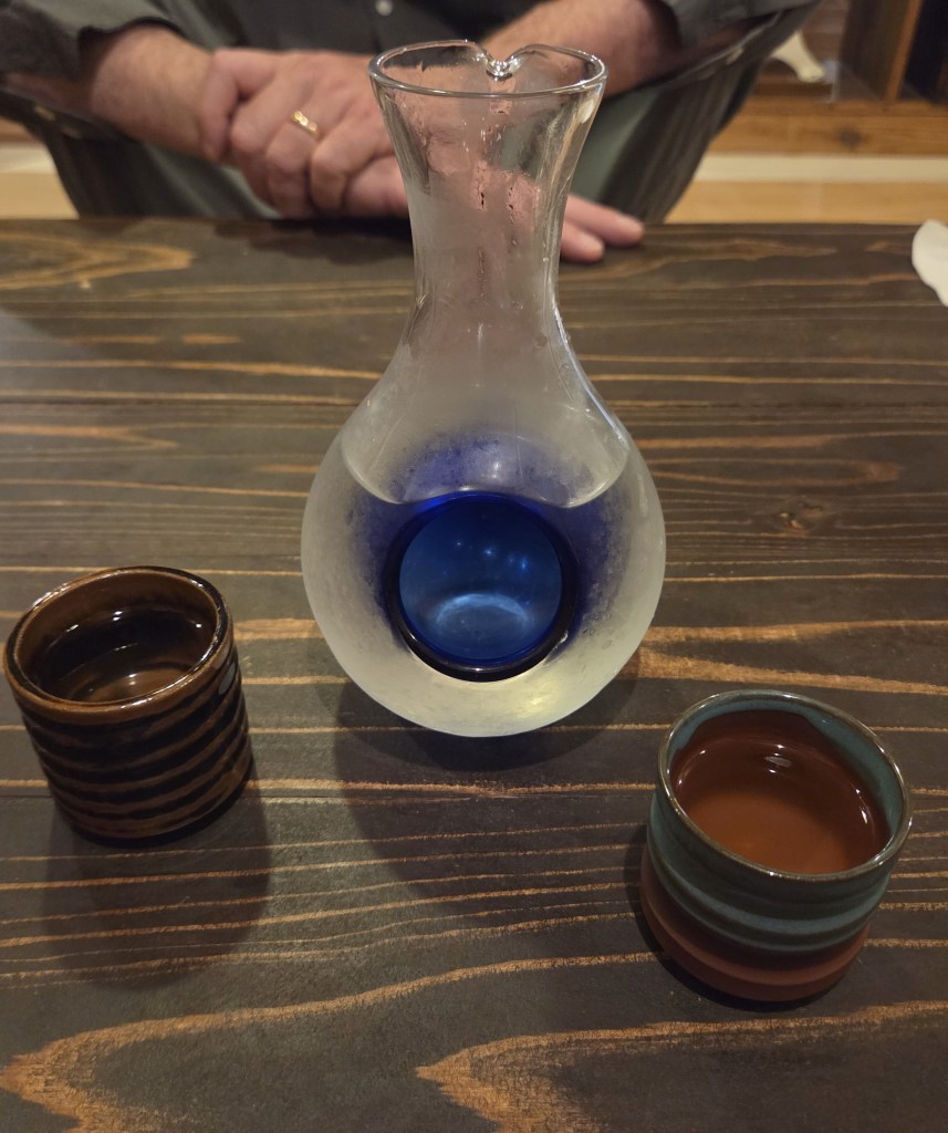For the sake, they first came in with a small clear glass that was chilled, which sat in maybe a 3” square and deep box that was black on the outside and red on the in. When they came in with the sake, the server filled the glass then overfilled it, filling the box and spilling out onto the table a little bit! A total surprise. I wondered if that is a custom generally or just what this place does.