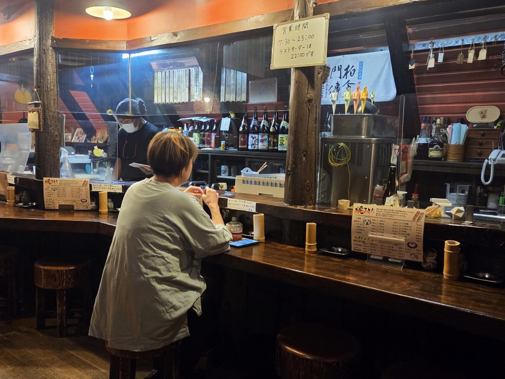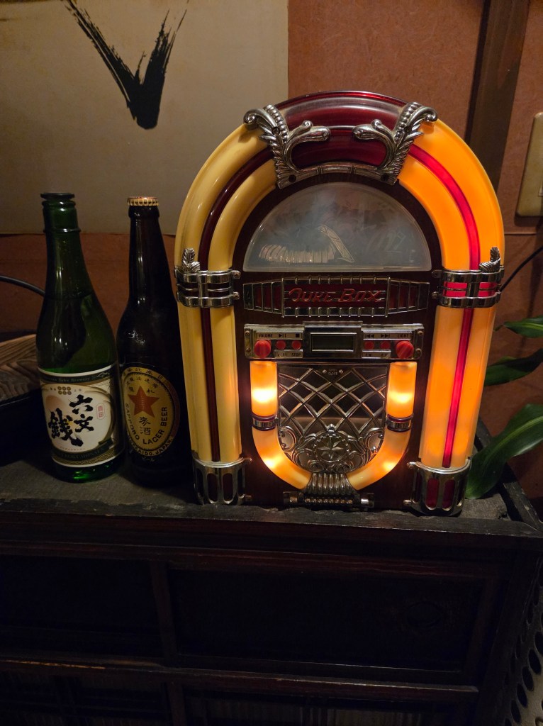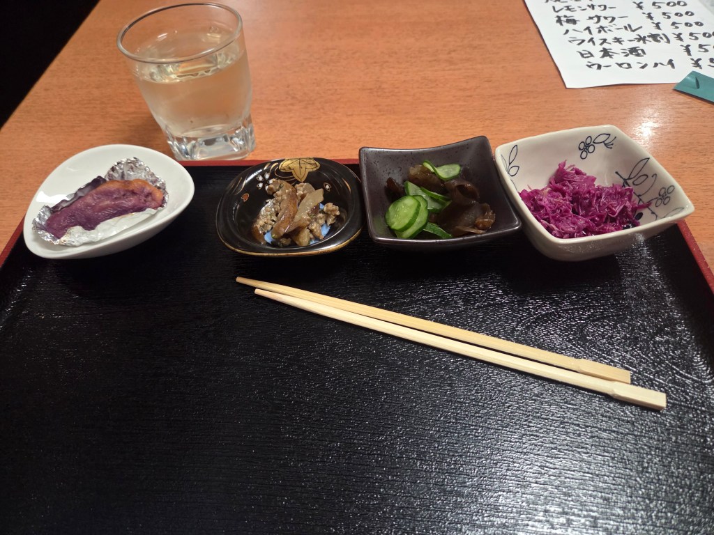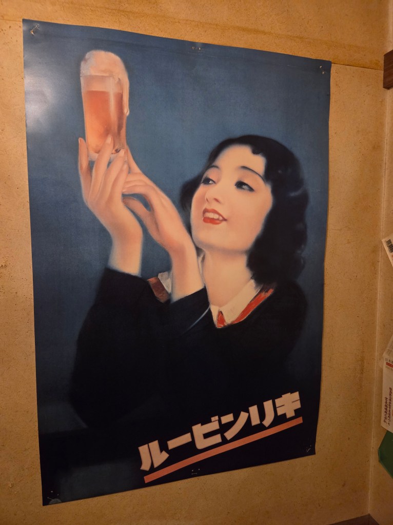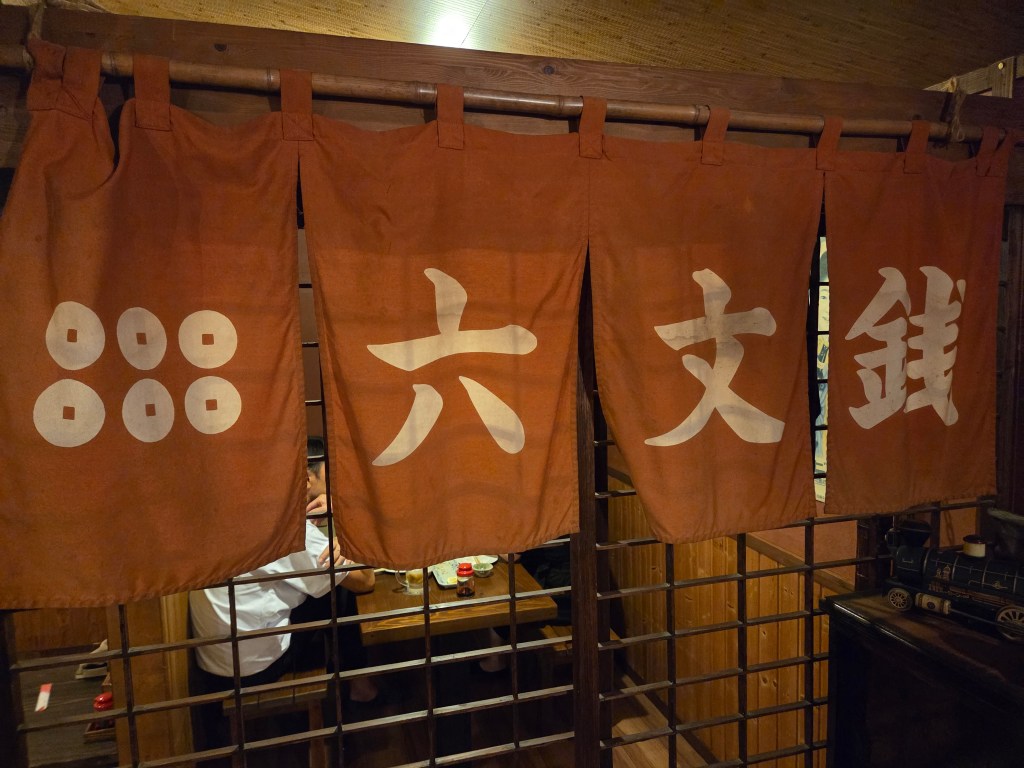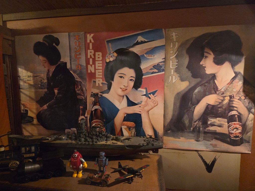 For dinner we went to another small restaurant off on a small dark side street that had good reviews online. The restaurant was run by a single person who cooked and served and ran the place by herself. The tables were traditional Japanese, low tables that one sat on the tatami floor by. The décor was old stuff – posters and various memorabilia. Needless to say at this point, the whole experience was exceptional. Appetizers were chikuwa and konnakyu, a first. (Look them up!) The main courses were delicious.