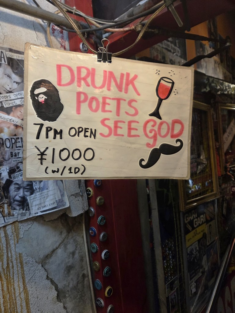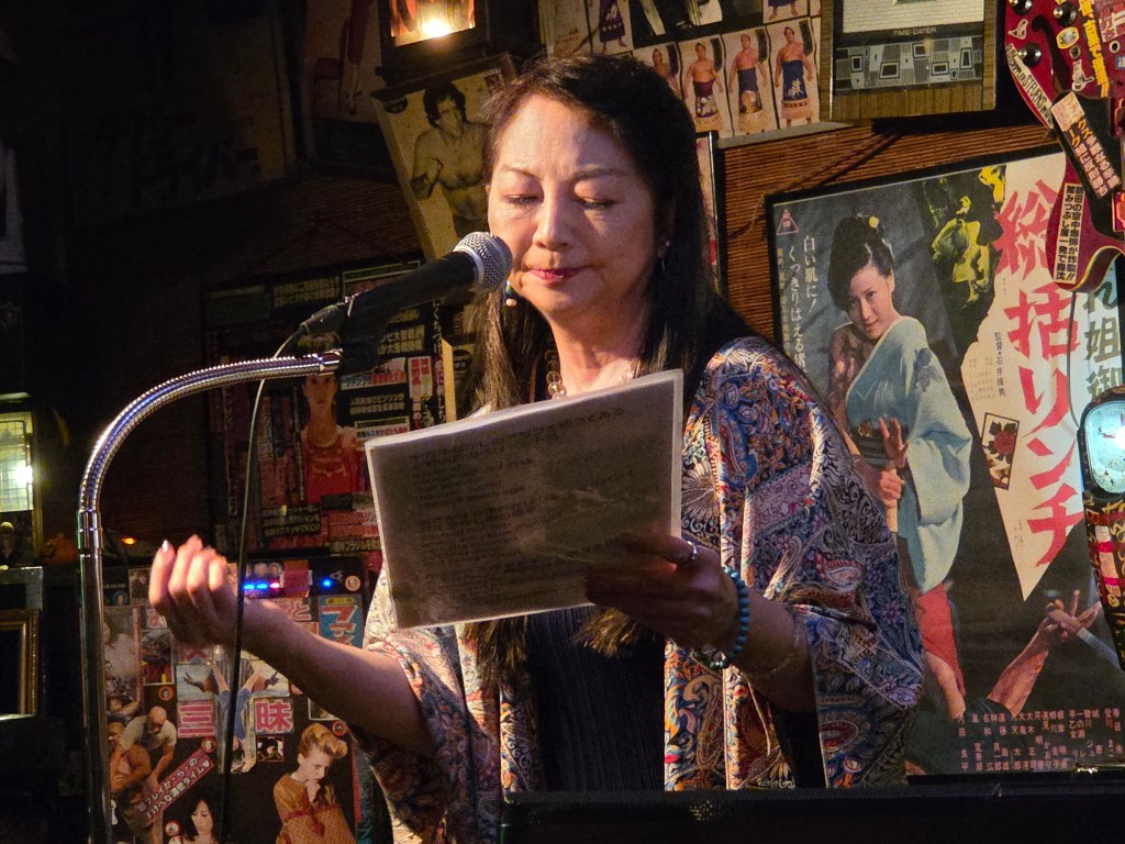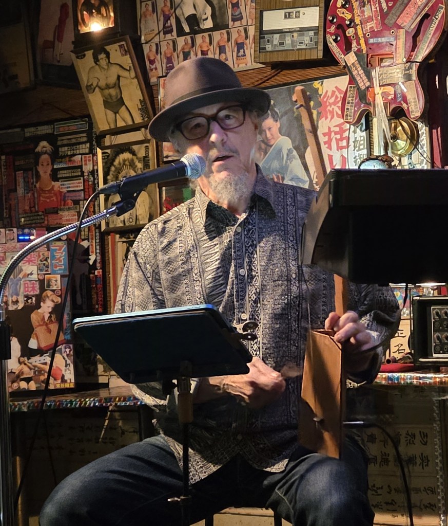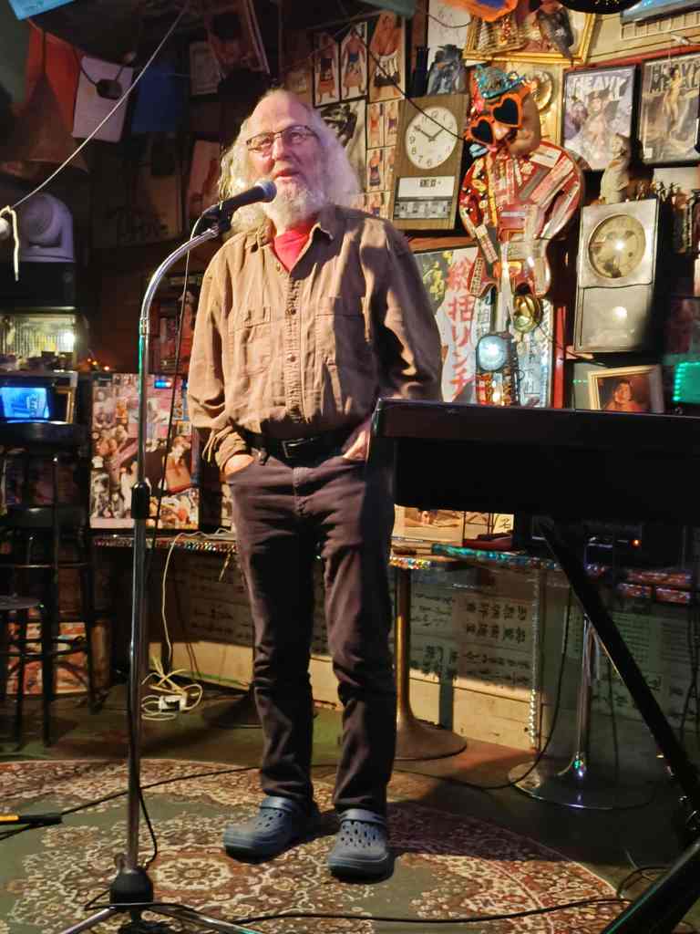 A short train ride took us there and we had a fantastic time. The two hosts, Samm and Joy, were very welcoming and excellent emcees. The series is held at what you might call a dive bar that is located down a long flight of steps. The open mic is for music and poetry and there was a combination of both presented. Mariko performed a series of tanka written after her 23 year-old cat recently died. Very moving. I recited three poems and then told my ginseng hunter story and had a very positive response from the audience. When leaving, Samm said everyone was really into what I shared and if ever back in Japan. . .