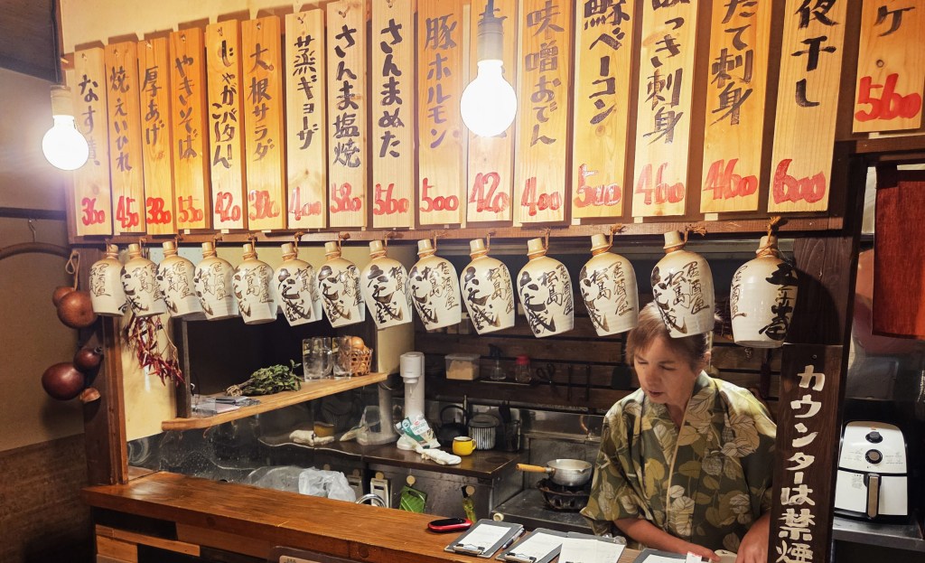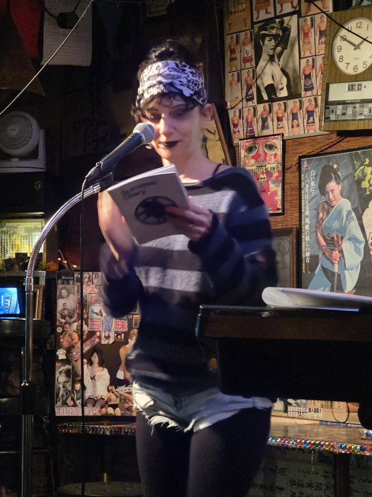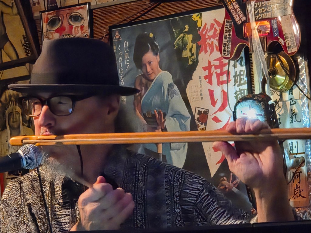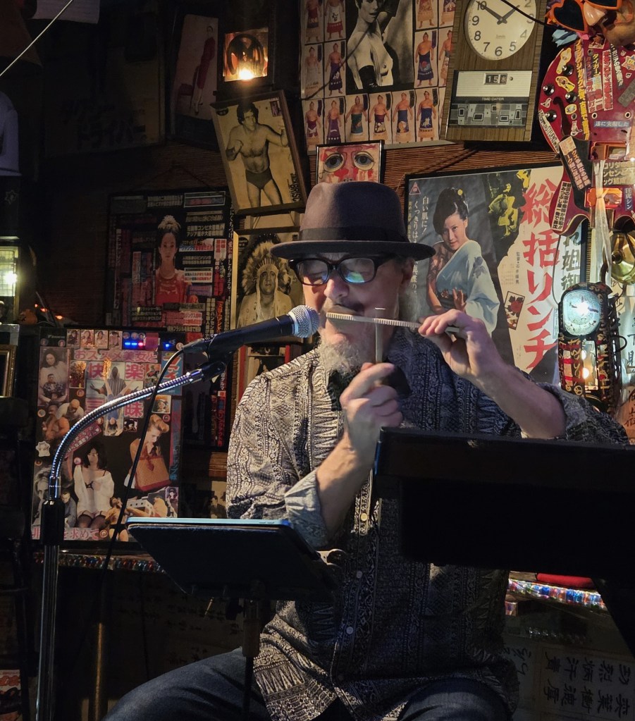 A short train ride took us there and we had a fantastic time. The two hosts, Samm and Joy, were very welcoming and excellent emcees. The series is held at what you might call a dive bar that is located down a long flight of steps. The open mic is for music and poetry and there was a combination of both presented. Mariko performed a series of tanka written after her 23 year-old cat recently died. Very moving. I recited three poems and then told my ginseng hunter story and had a very positive response from the audience. When leaving, Samm said everyone was really into what I shared and if ever back in Japan. . .