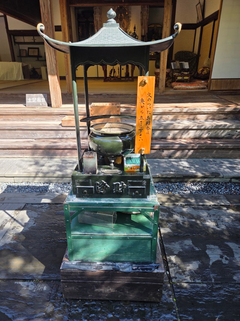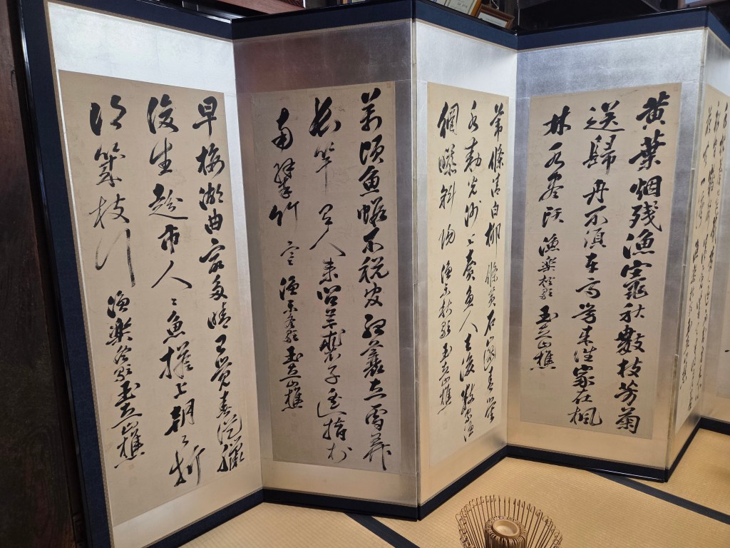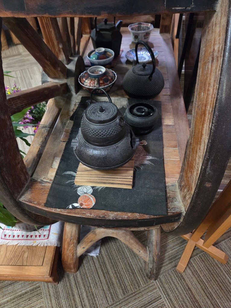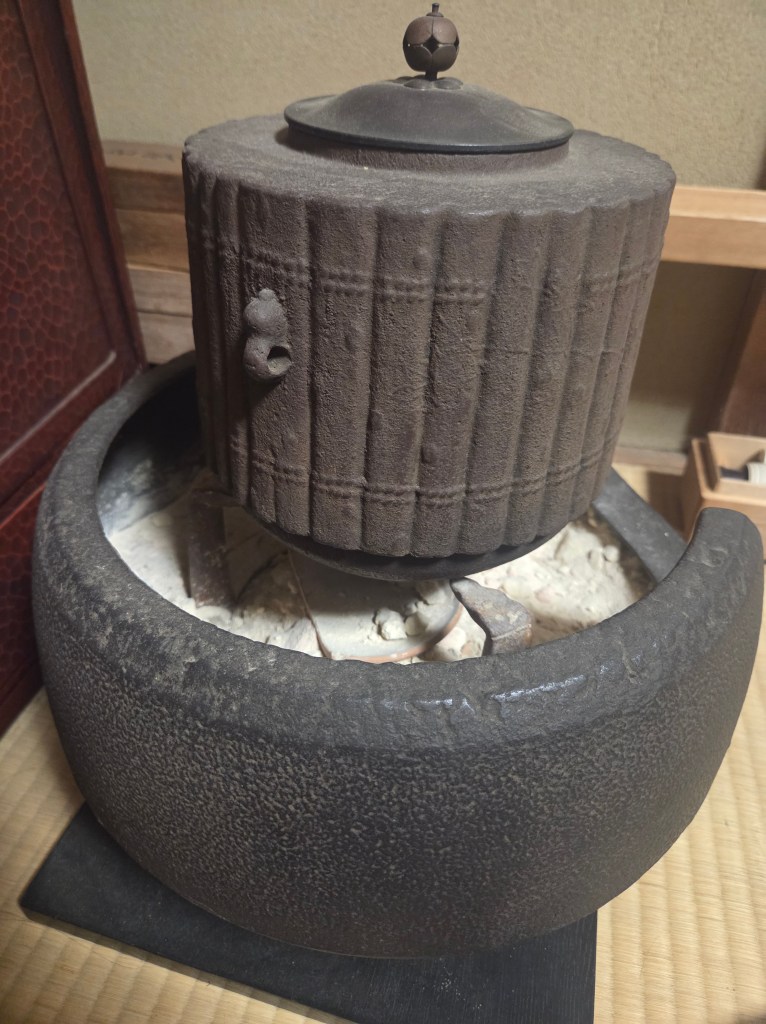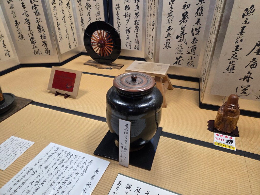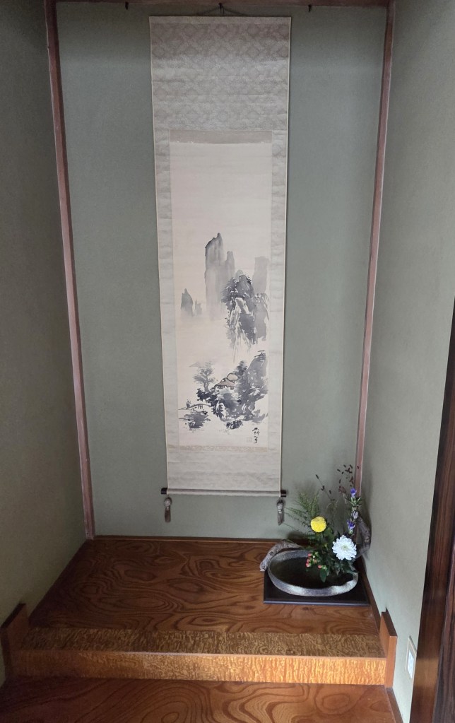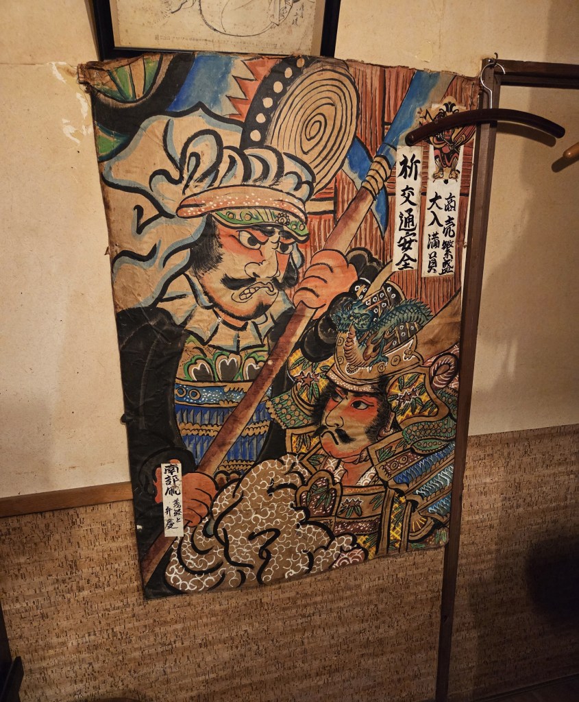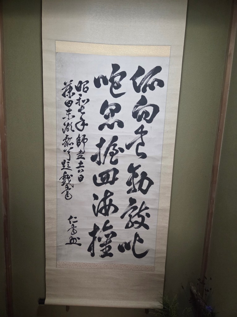 At the house Mariko showed me an old water pot set on top of a charcoal burner that her grandmother used when she performed tea ceremonies. Then a large calligraphy scroll that was made by her grandfather. A couple of meaningful family treasures.