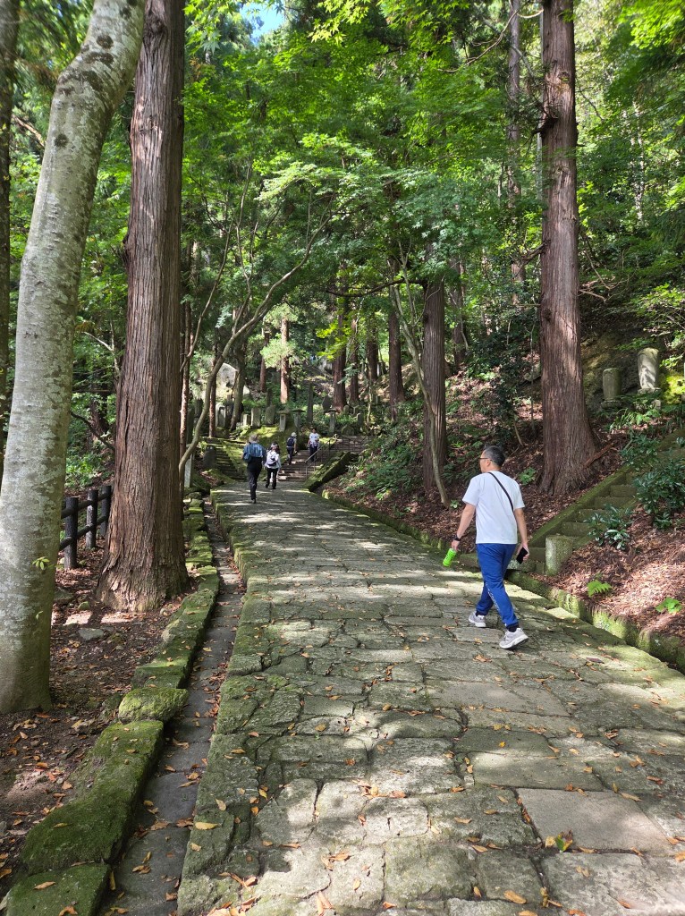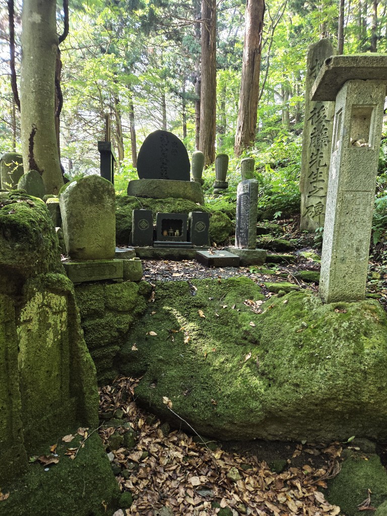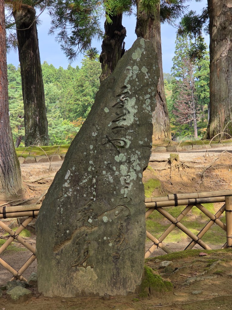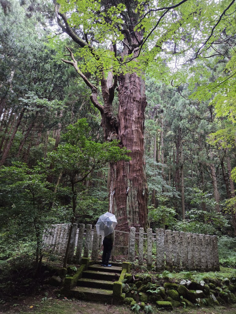 After we departed the onsen we all stopped at Hokoin Temple where there are stone monuments with poems by Basho and Ryokan. The others then departed and Kazuaki and I walked the temple grounds. A monk there gave us each an umbrella and said we should keep them. Besides stone monuments and a cemetery there is a giant Cedar tree that is thought to be over 1,000 years old!