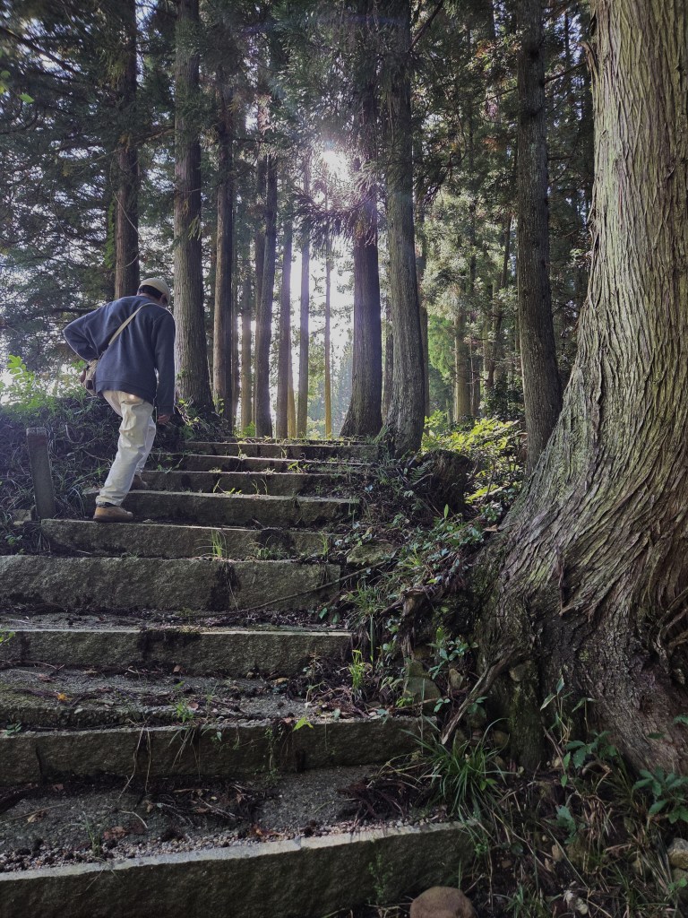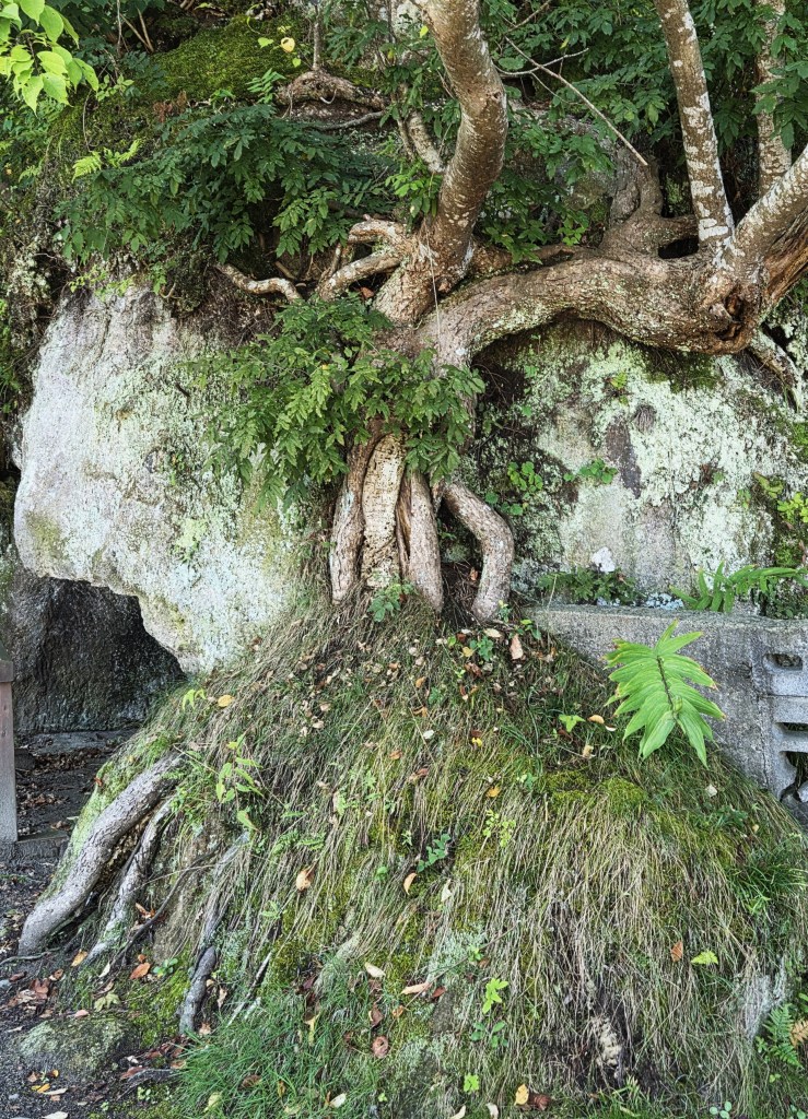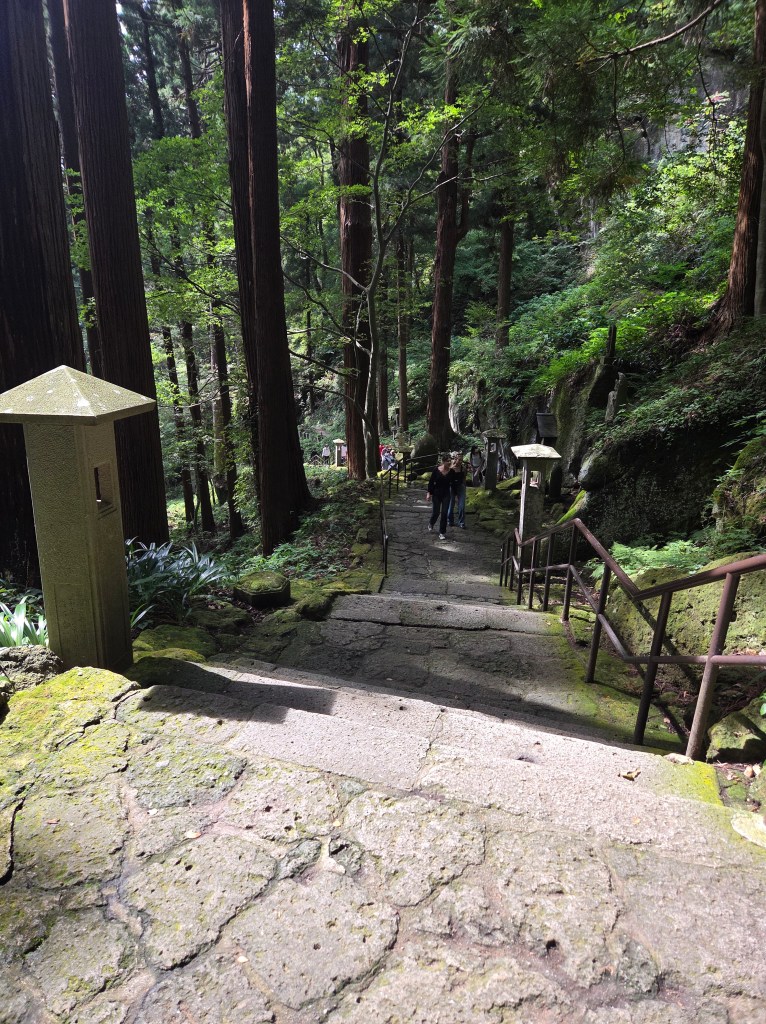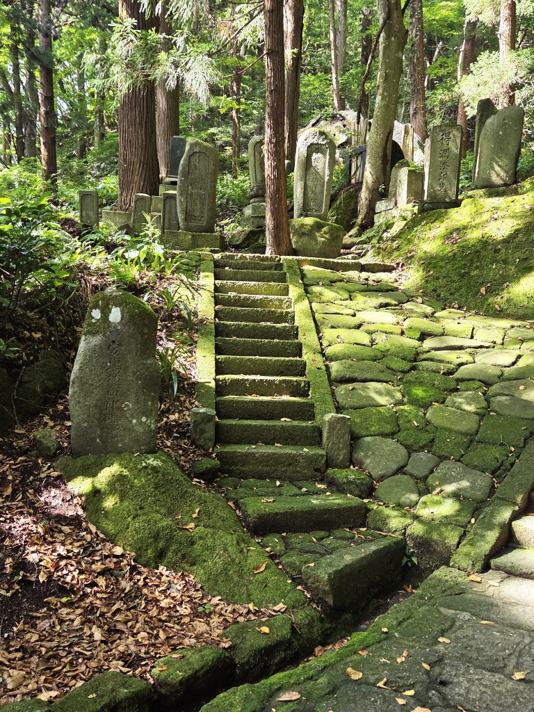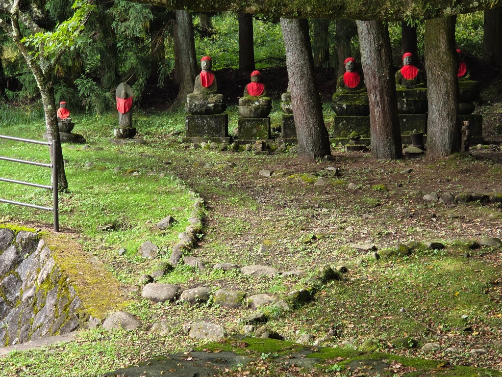 After we departed the onsen we all stopped at Hokoin Temple where there are stone monuments with poems by Basho and Ryokan. The others then departed and Kazuaki and I walked the temple grounds. A monk there gave us each an umbrella and said we should keep them. Besides stone monuments and a cemetery there is a giant Cedar tree that is thought to be over 1,000 years old!