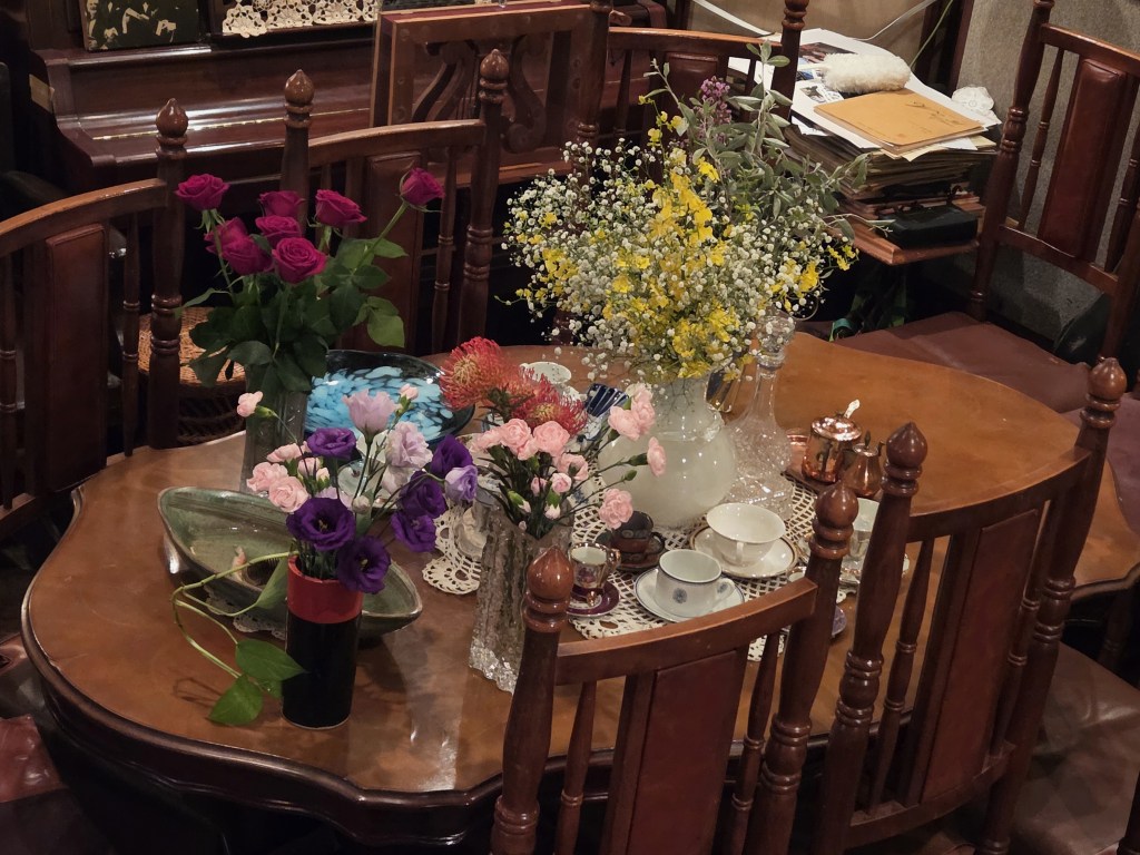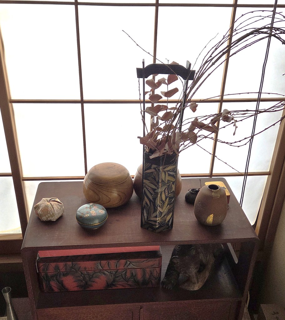 Before leaving Shibata we stopped one more time at Tanka Café for a little meal. The owner, Shiigehasu had just put a number of flower arrangements on the dining table in the café. Once again, a contented time in this quiet, comfortable place in Shibata.