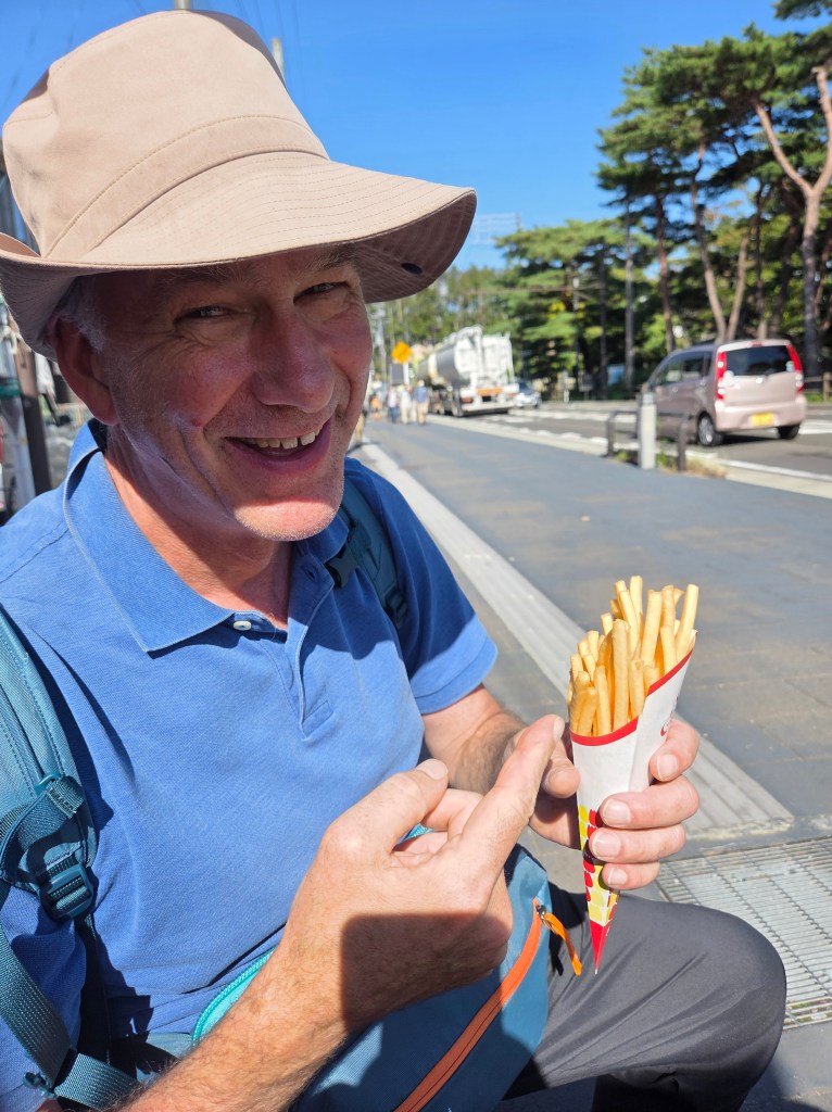 Afterwards we walked around a bit. Bart stopped into a small ice cream place that served only soft vanilla ice cream and was run by an elderly woman with white hair and braids. I didn’t get any, but reminded Bart that in Japan one doesn’t eat food and walk around with it. It is customary to eat in or right by the place it is ordered. So, he ordered and sat inside the small place while I sat down a couple of doors away absorbing what was going on around me. Maybe 10 minutes later Bart called me over to come inside. He had struck up a conversation with two couples sitting inside with their ice cream. There were only maybe six seats inside. It was a very small place. So, I joined in, and while sitting there the ice cream woman gave me a small cone of her vanilla ice cream! We talked a little with the other couples about Basho, etc. and then the woman gave us each a small cup of tea. It was a vibrant experience in one of the small local businesses. As we left, Bart said we’d be back tomorrow evening!